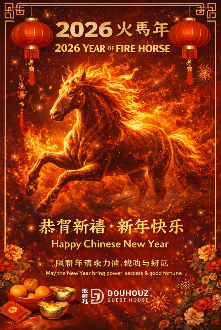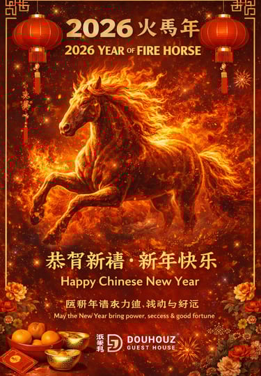 Welcome the powerful Fire Horse Year (火马年) with joy, prosperity, and unforgettable travel memories at DouHouz Guest House.